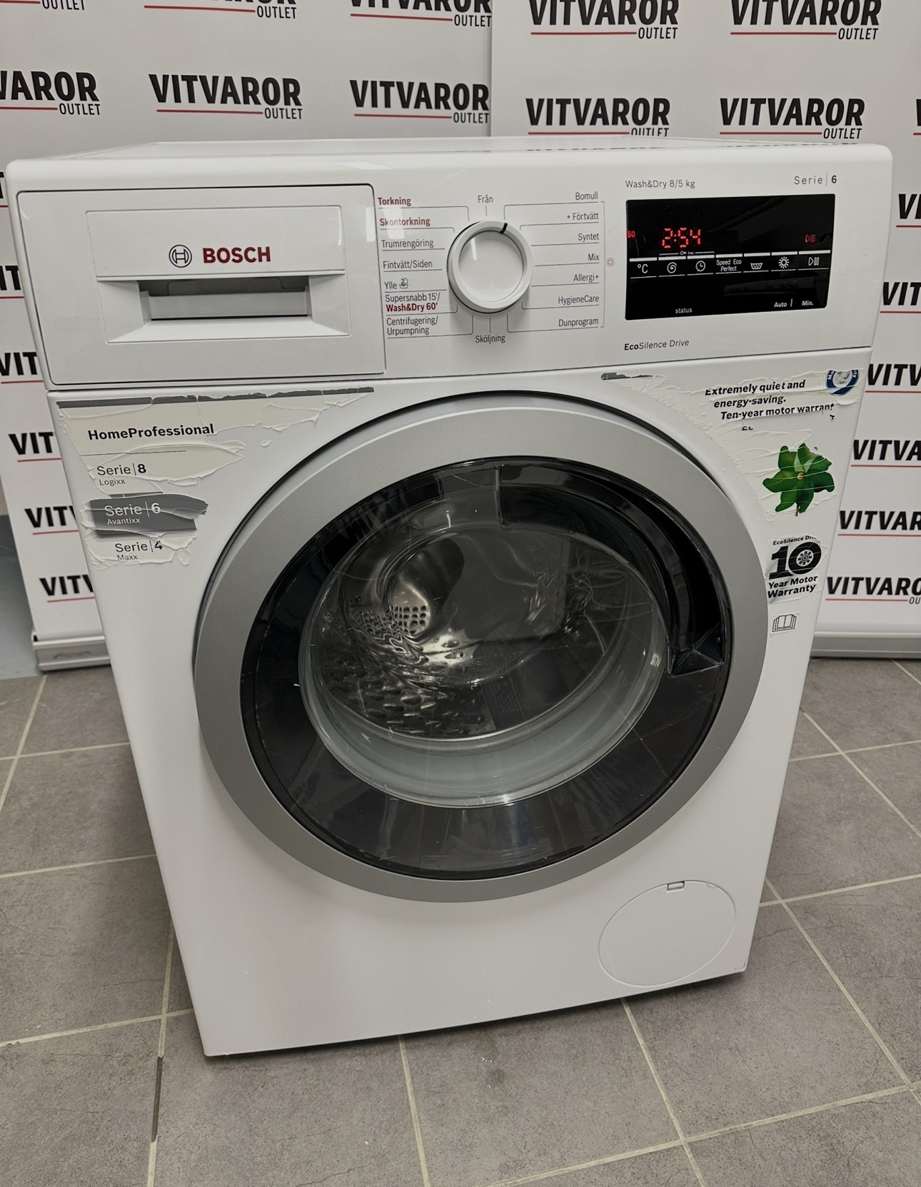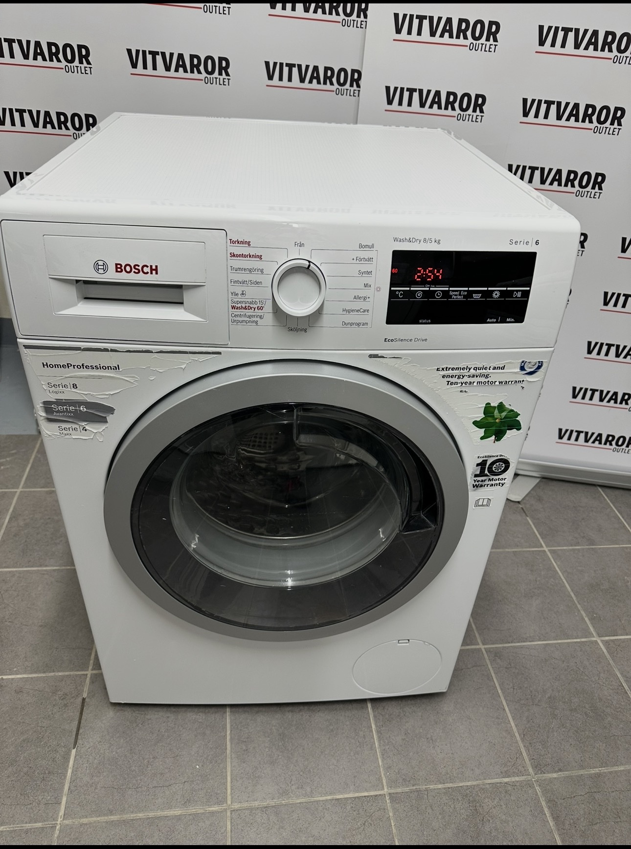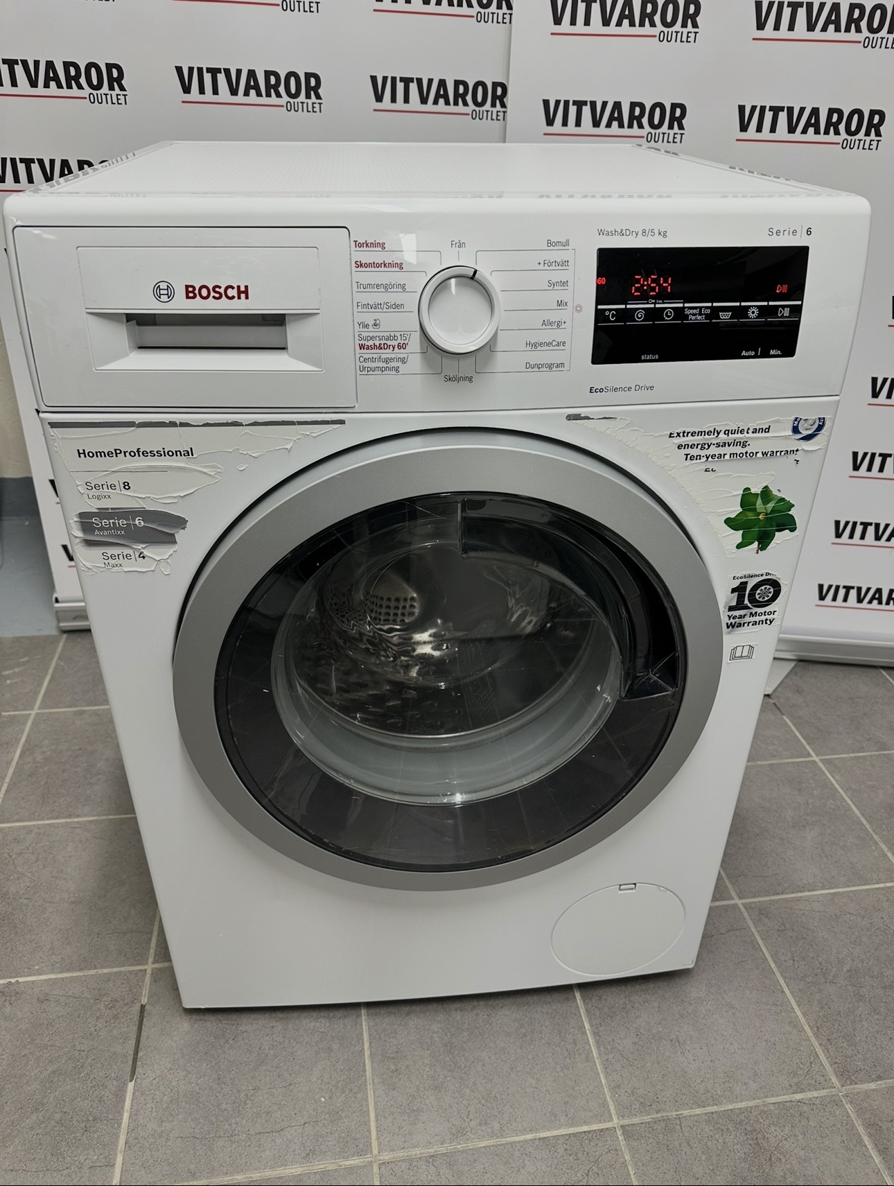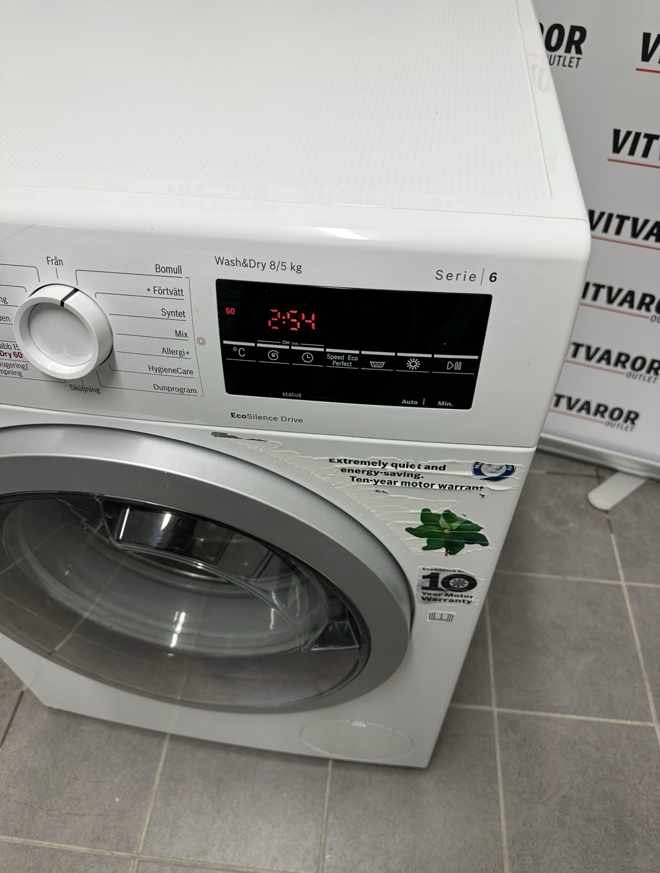 Kombinerad tvättmaskin med torktumlare, tillverkad av Bosch Serie 6. Utrustad med den särskilt energisnåla och hållbara EcoSilence Drive-motorn!