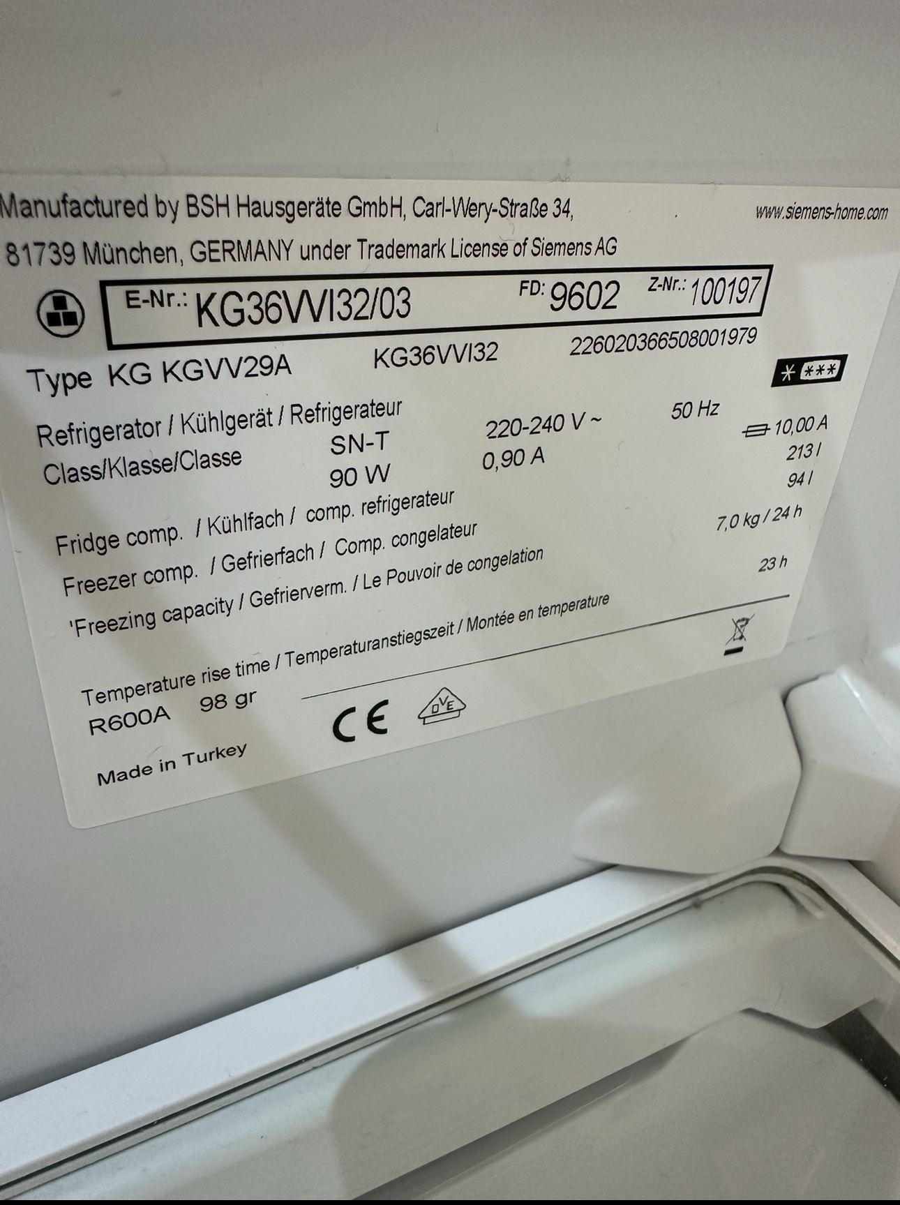 • Märke / Modell: Siemens iQ500 (KG36VVI32)